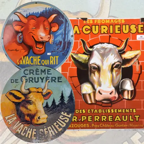 LA VACHE QUI RIT : Plaque émaillée ronde bombée, illustrée d'après Benjamin. Rabier (1864-1939). Ces plaques émaillées La vache qui rit sont adjugées entre 4500€ et 12 000€ en fonction de l'état. LA VACHE SÉRIEUSE est un tôle lithographiée. La valeur est beaucoup moindre (500€ environ). LES FROMAGES LA CURIEUSE PERRAULT : Plaque émaillée illustrée d'après HENRI LEMONNIER - Adjugée 12 000€ hors frais