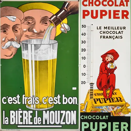 Arts Publicitaires : Plaques émaillées. Ces magnifiques plaques émaillées se sont vendues entre 25 000€ et 45 000€ aux enchères.