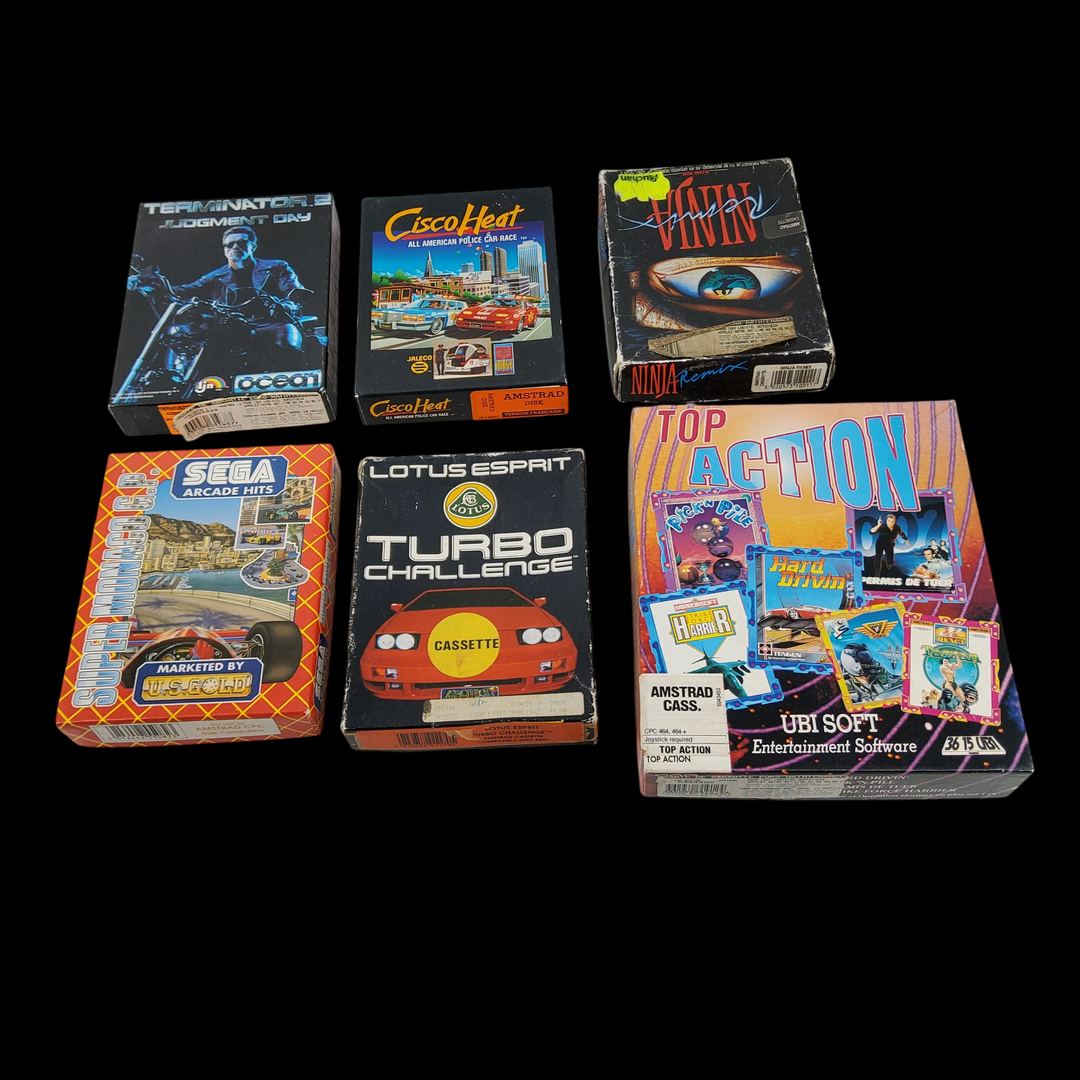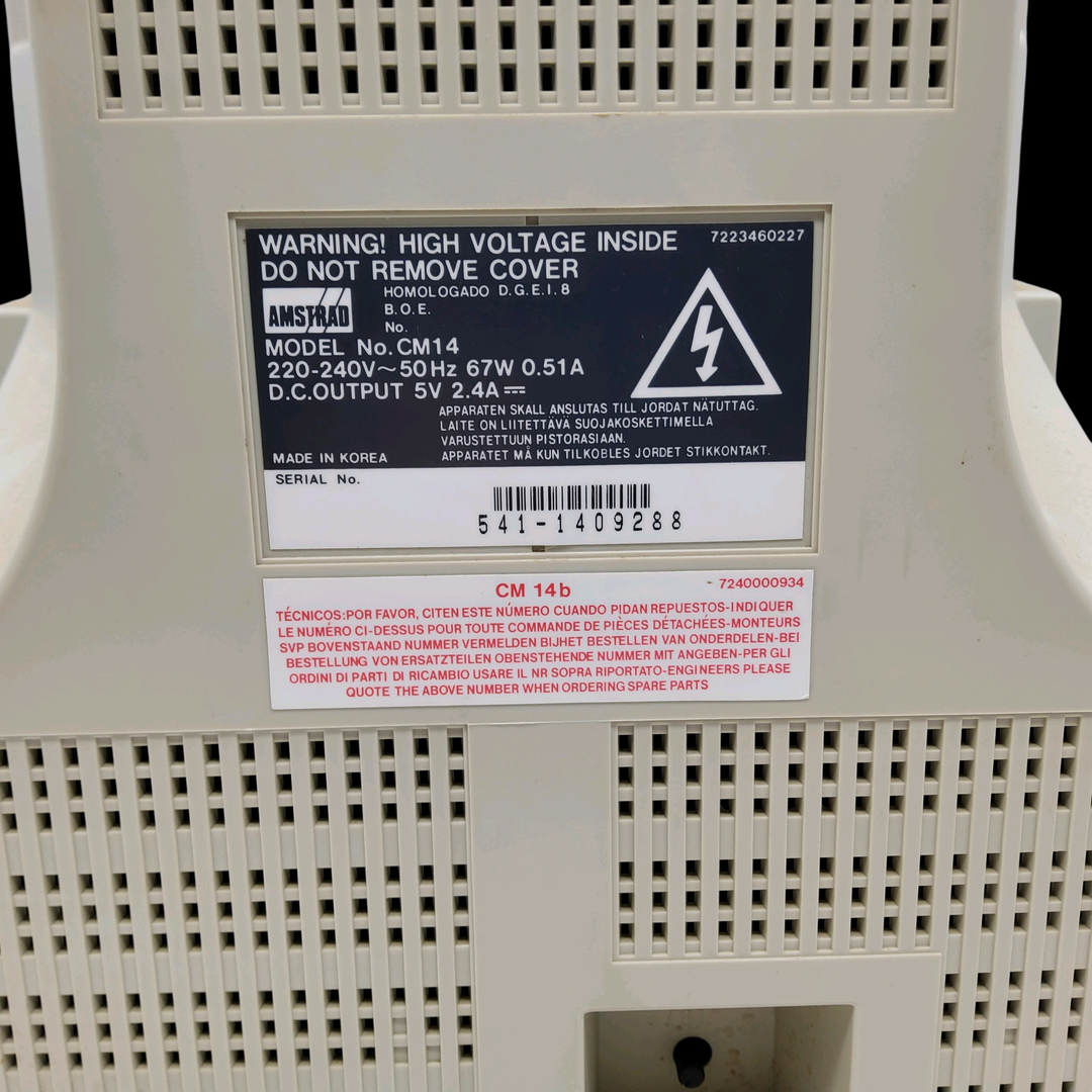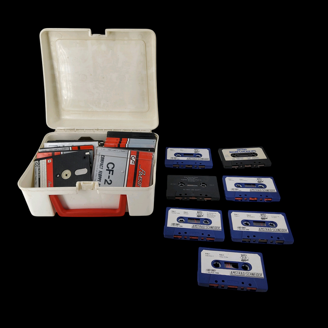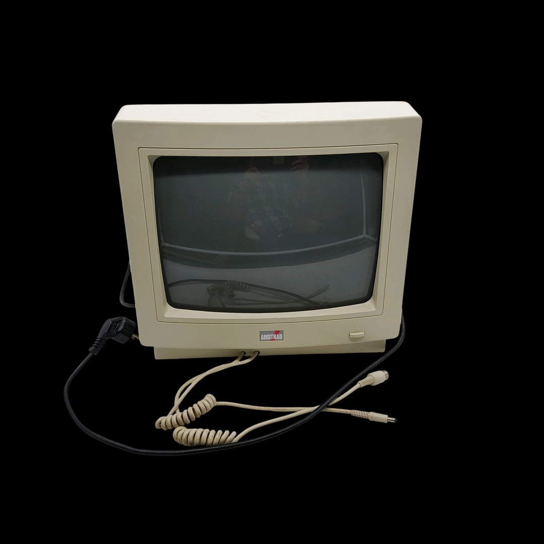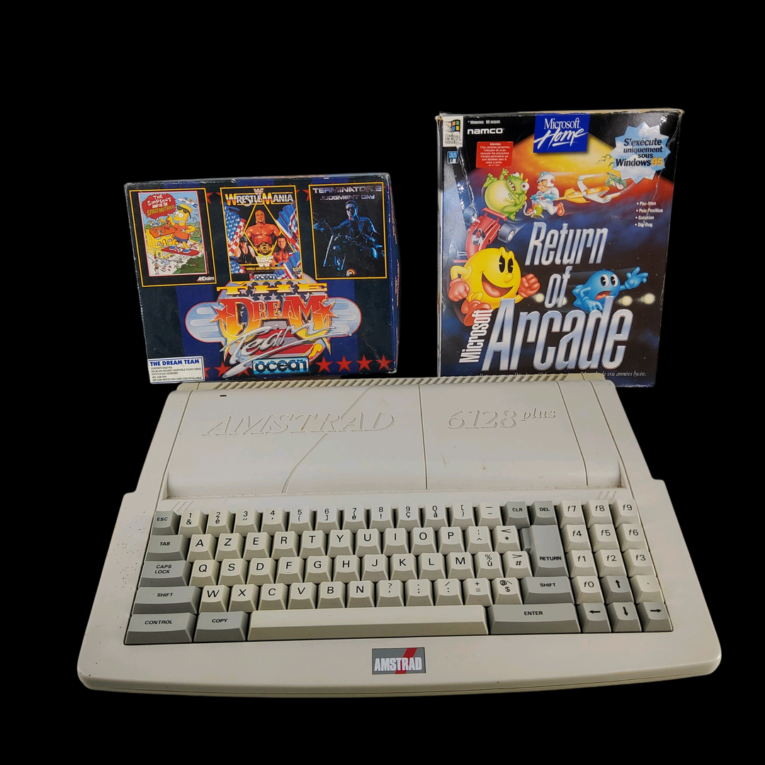 Amstrad – Écran Amstrad CM14 (Test d’allumage effectué avec succès) – Micro ordinateur Amstrad 6128 – Test d’allumage non concluant. Avec un lot de câbles & manettes, lot de 5 jeux.