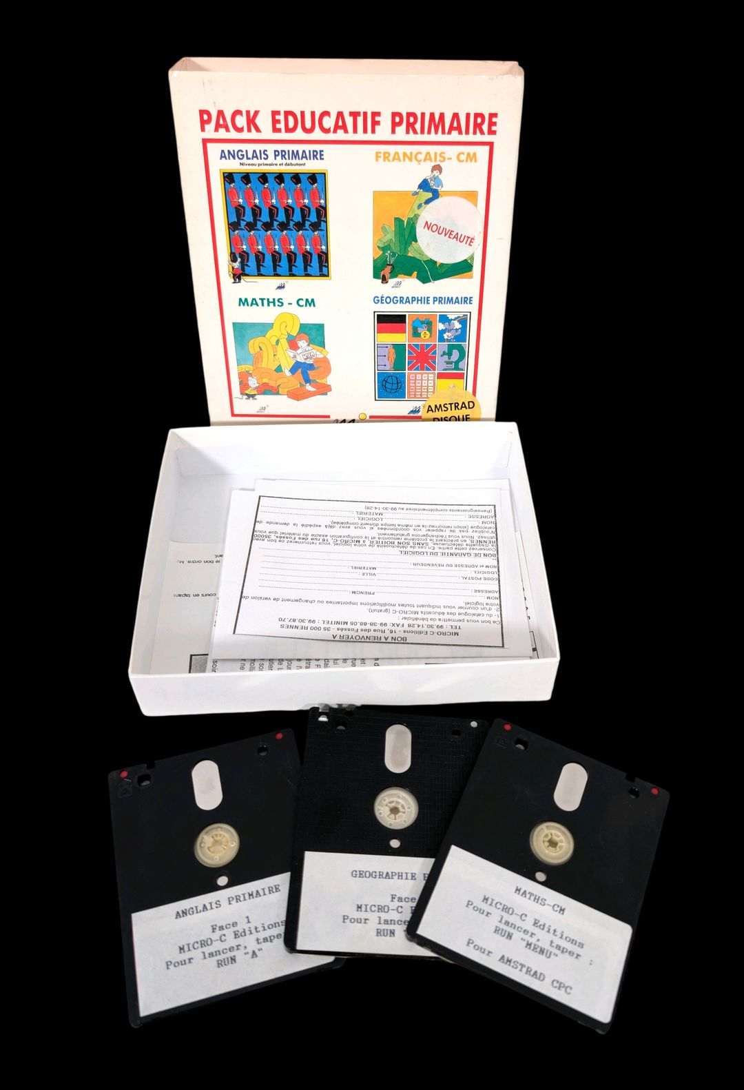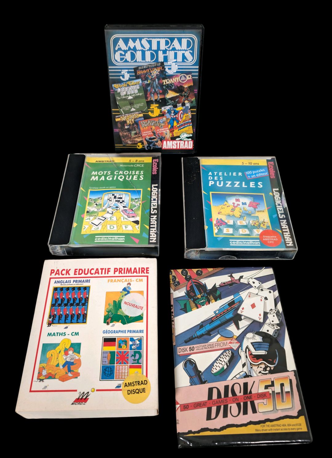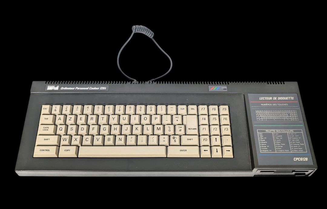 Amstrad – Ordinateur personnel – Amstrad modèle CPC6128. Test d’allumage effectué avec succès. Avec clavier Amstrad, 5 jeux sur disquettes dont des jeux éducatifs, ainsi que les protections pour l’écran et le clavier.