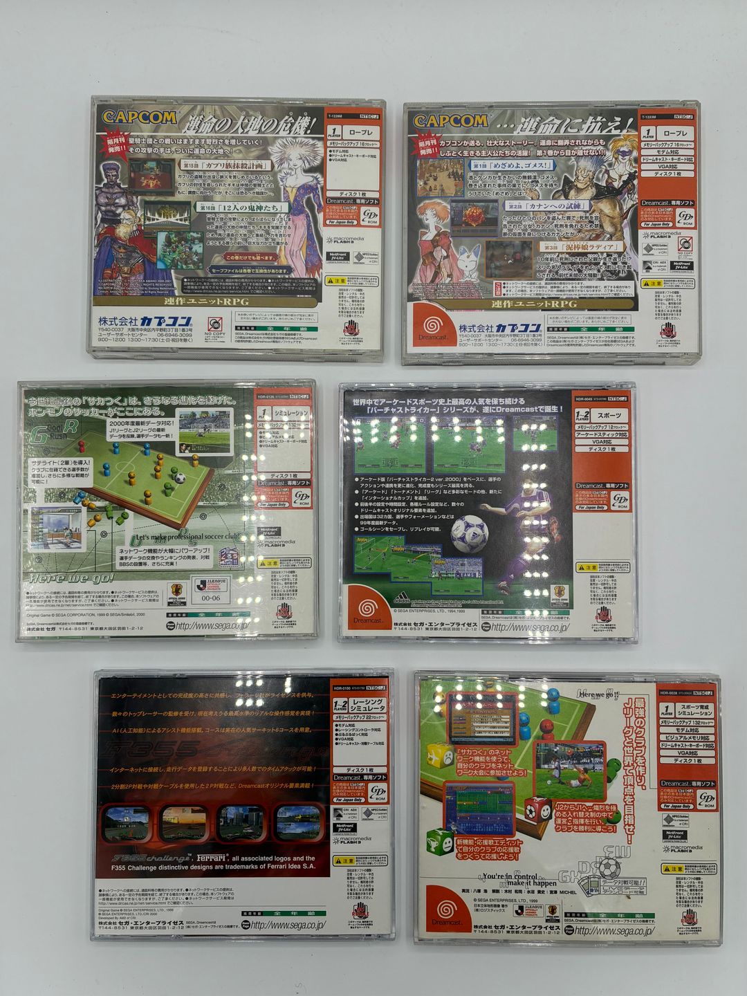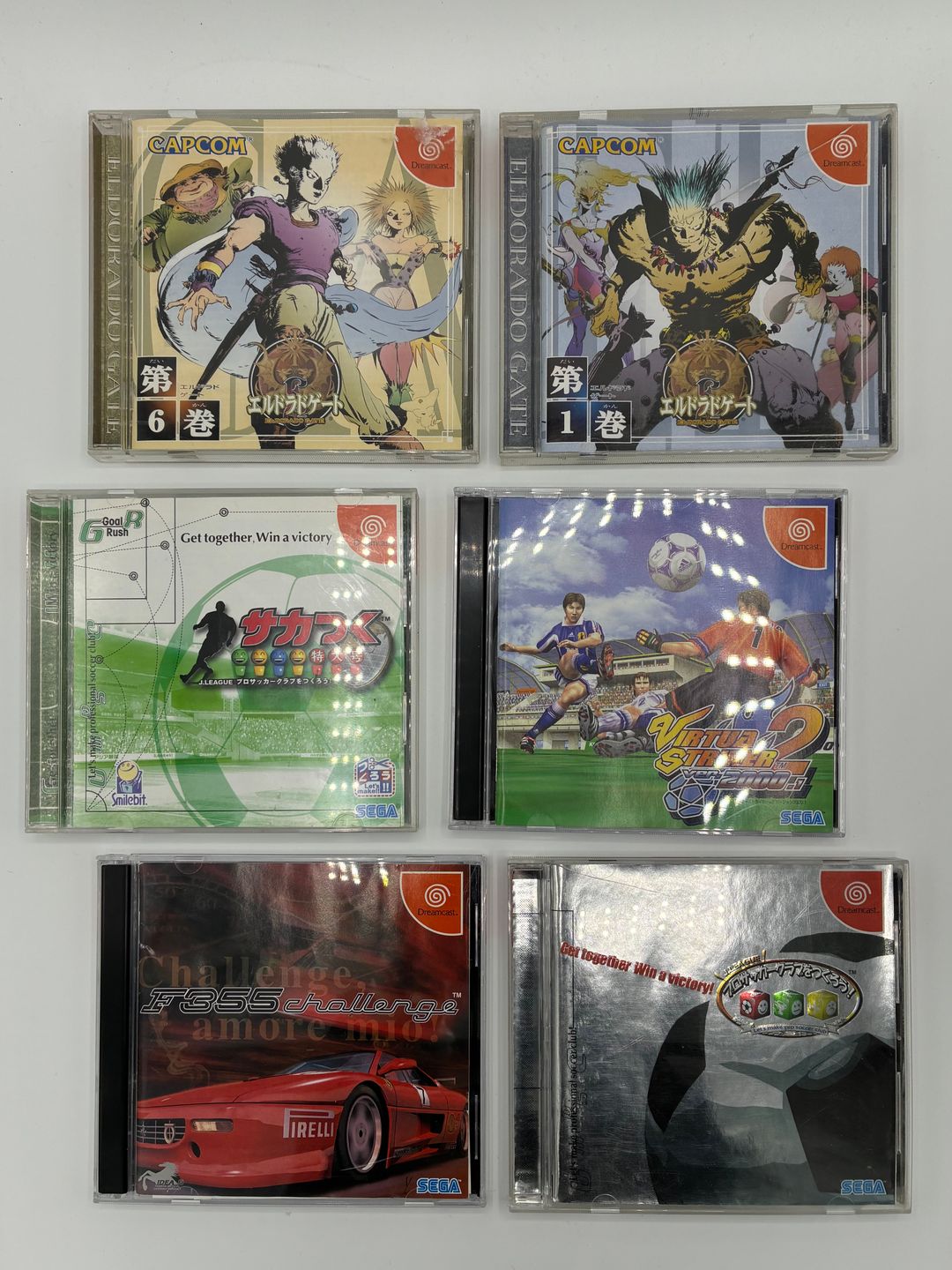Dreamcast – Lot de 6 jeux édition japonaise comprenant : – El Dorado Gate vol.1 – El Dorado Gate vol 6 – Virtua Striker ver.2000 2 – J-League Soccer Tsuku Tokudaigou – F355 Challenge – J-League Professional Soccer Club