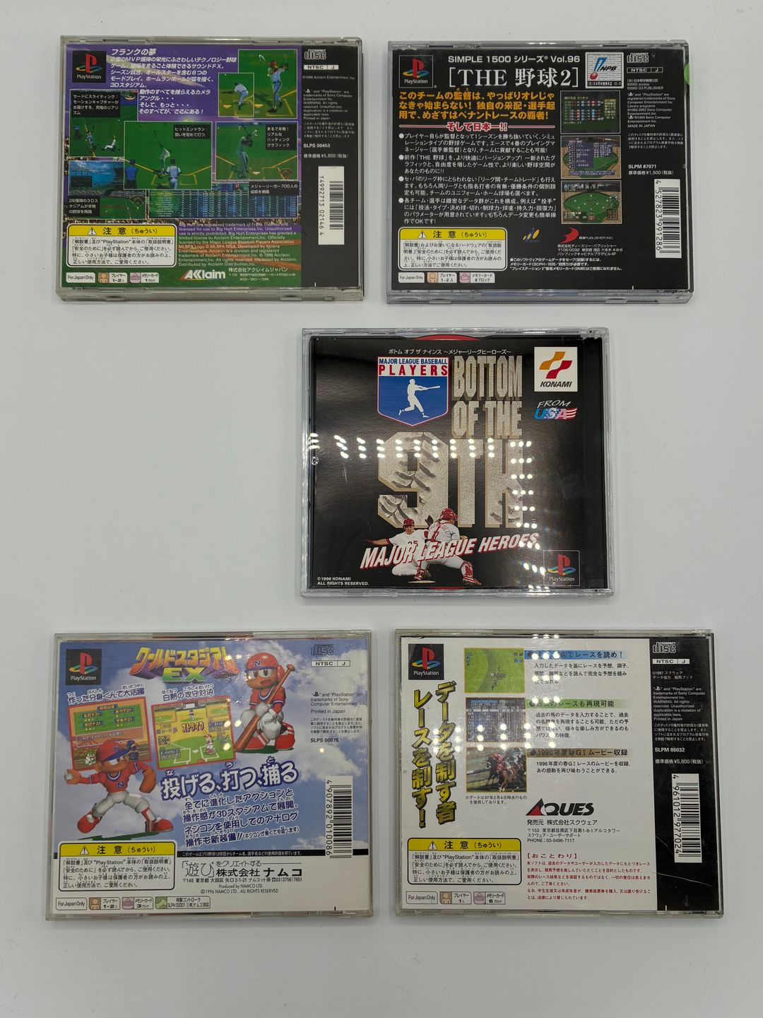 Lot de 5 jeux Playstation 1 édition japonaise comprenant : – Frank Thomas Big Hurt Baseball – Simple 1500 Series Vol.2 – Play Stadium Japan 3W – Power Stakes – World Stadium Ex Baseball Complets et dans leurs boîtes d’origine