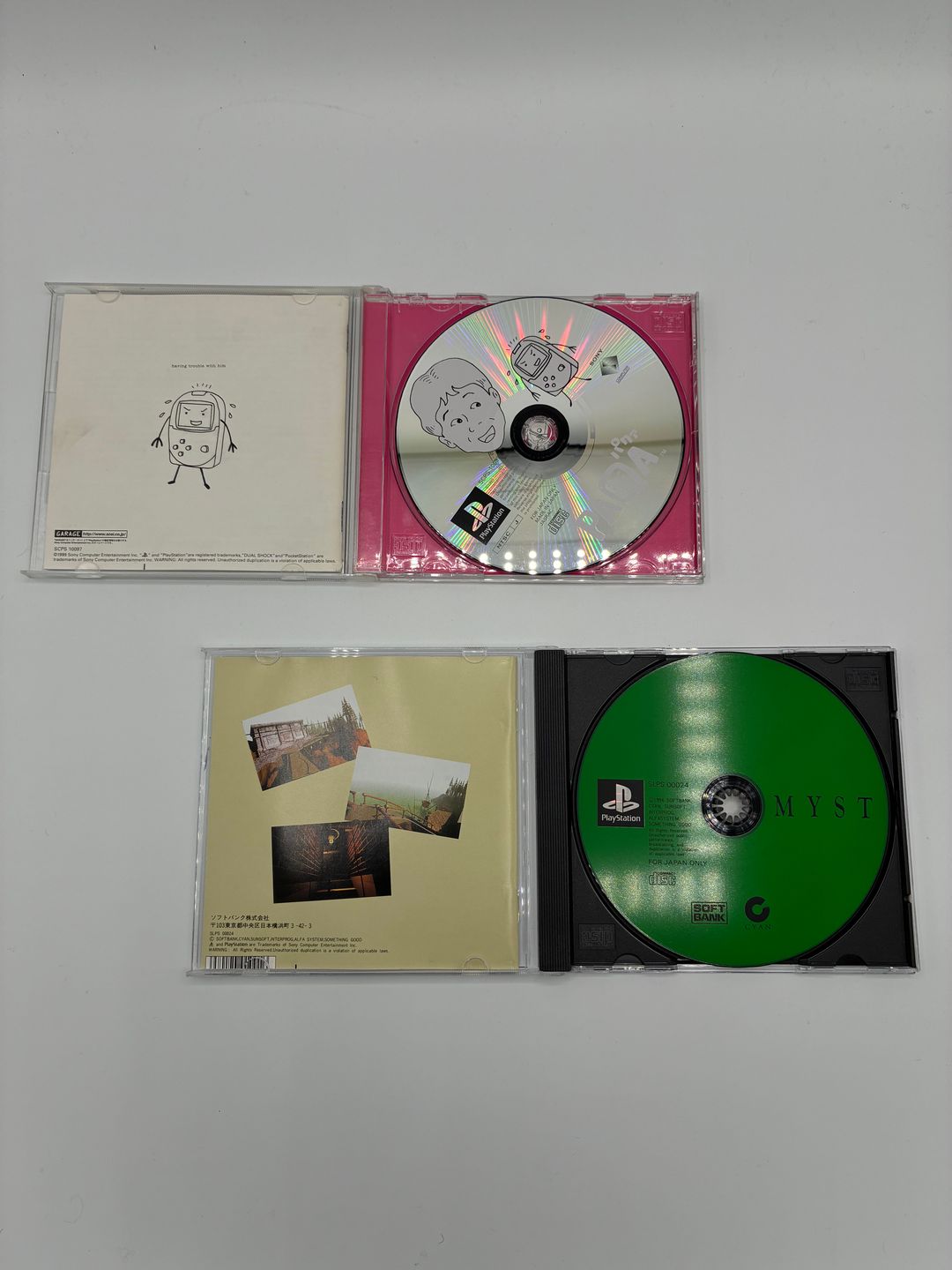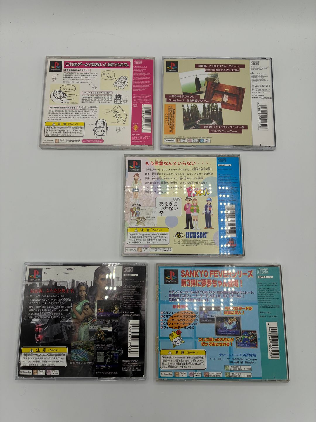 Lot de 5 jeux Playstation édition japonaise comprenant : – Sankyo Fever vol.3 – Front Mission 2 – Pi to Mail – Myst – Paqa Complets et dans leurs boîtes d’origine