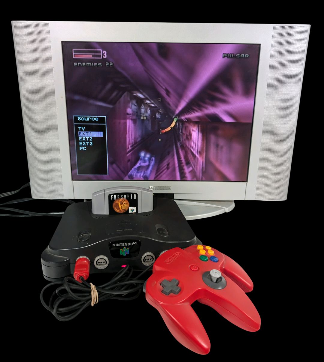 Nintendo – Console de salon (Vendue sans le jeu) – Nintendo 64. Test d’allumage effectué avec succès. Avec 4 manettes officielles fonctionnelles, cordon d’alimentation, câble péritel, ainsi qu’un Transfer Pak pour les jeux GameBoy Color et un Rumble Pak pour les vibrations de manettes.