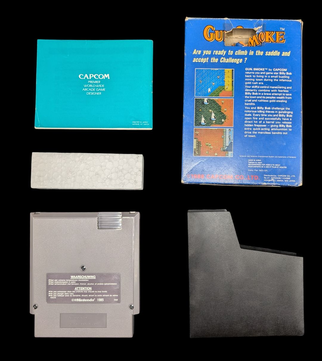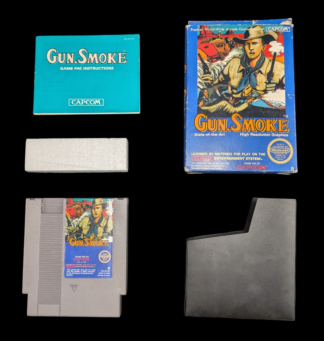 Nintendo – Nes – Jeu Gun. Smoke. Avec boîte, fourreau, notice, cale en polystyrène. Version du jeu FAH.