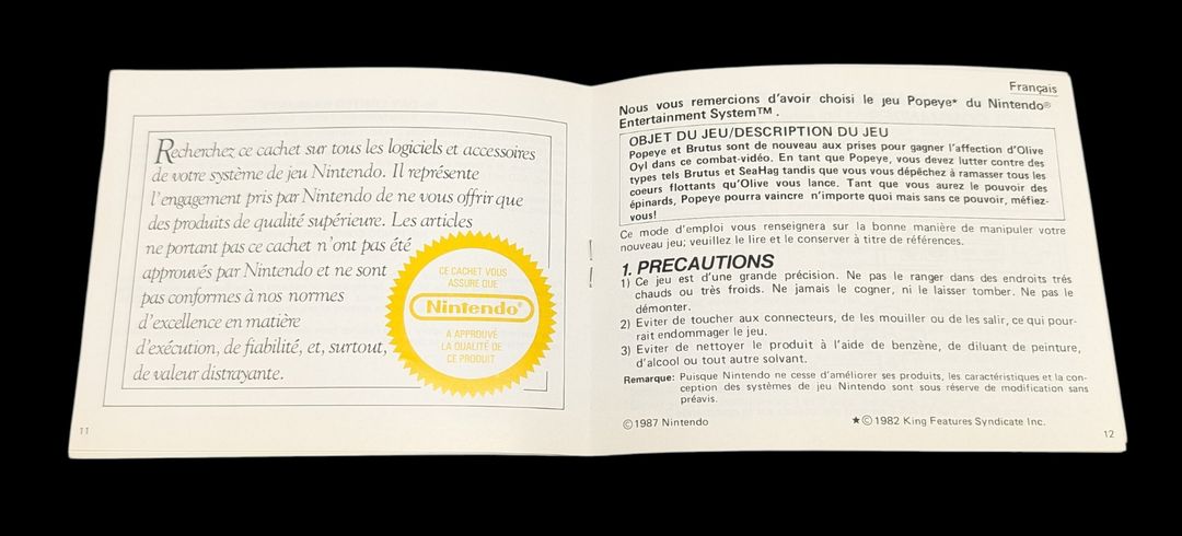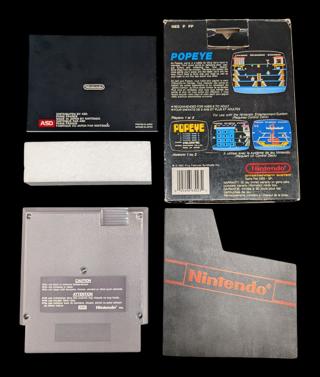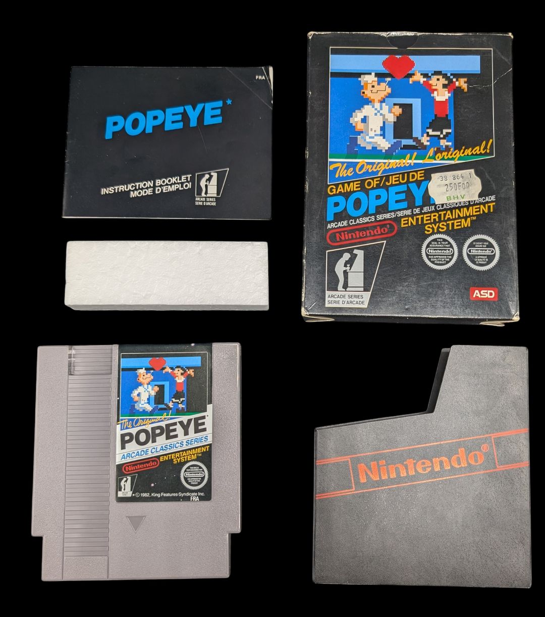 Nintendo – Nes – Jeu Popeye. Avec boîte, fourreau, notice, cale en polystyrène. Version du jeu FRA. Mention ASD (Première distribution française).