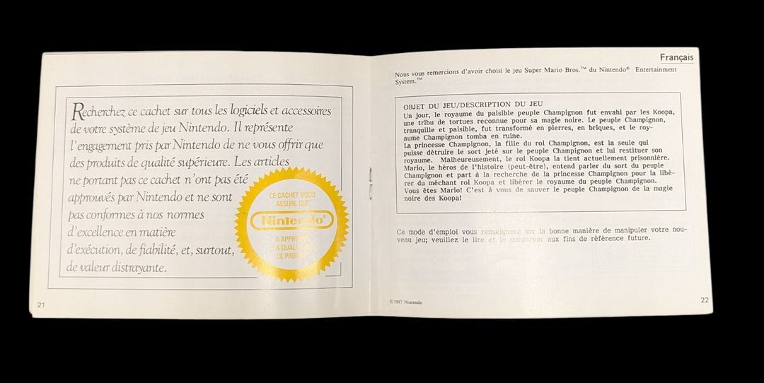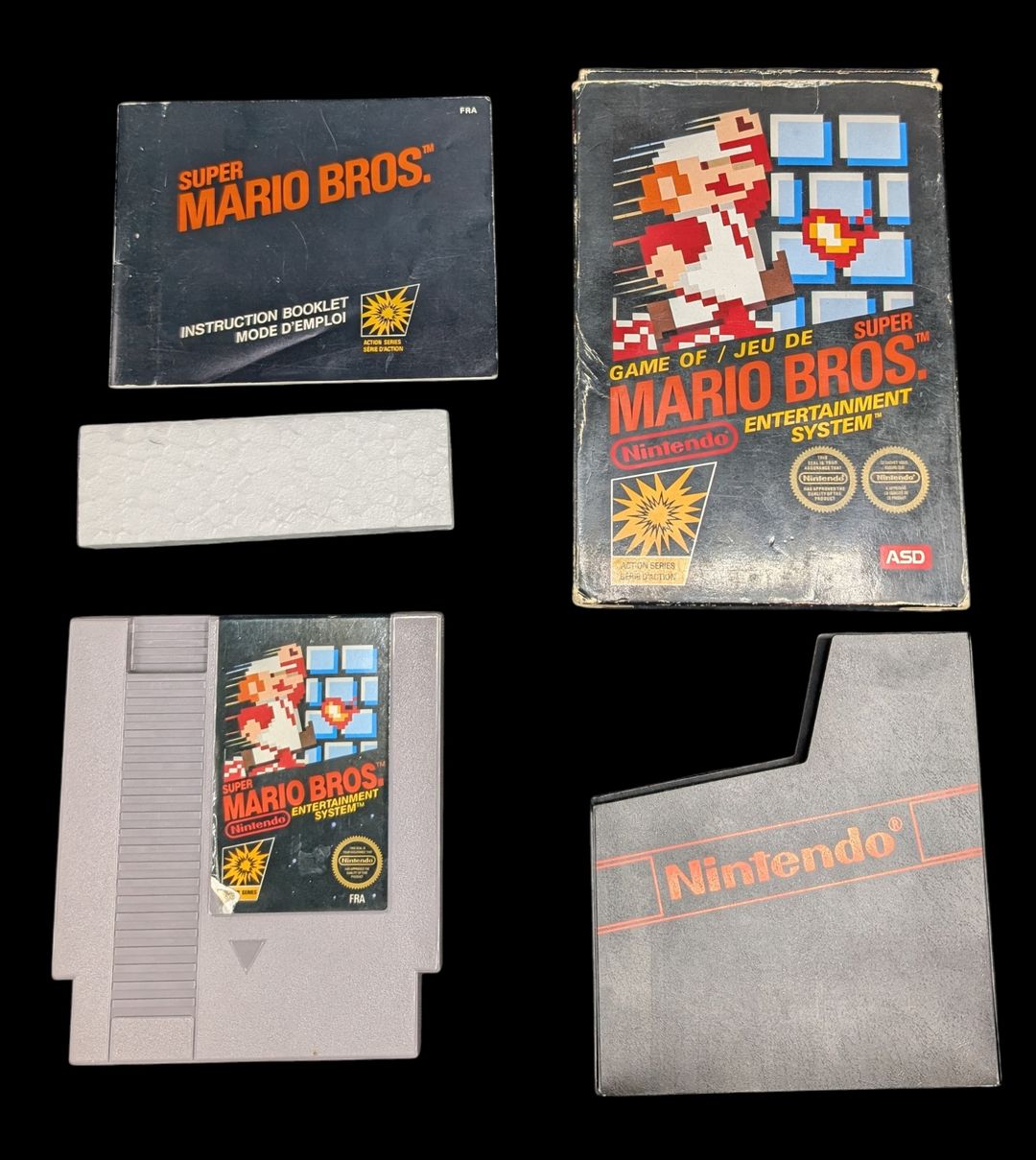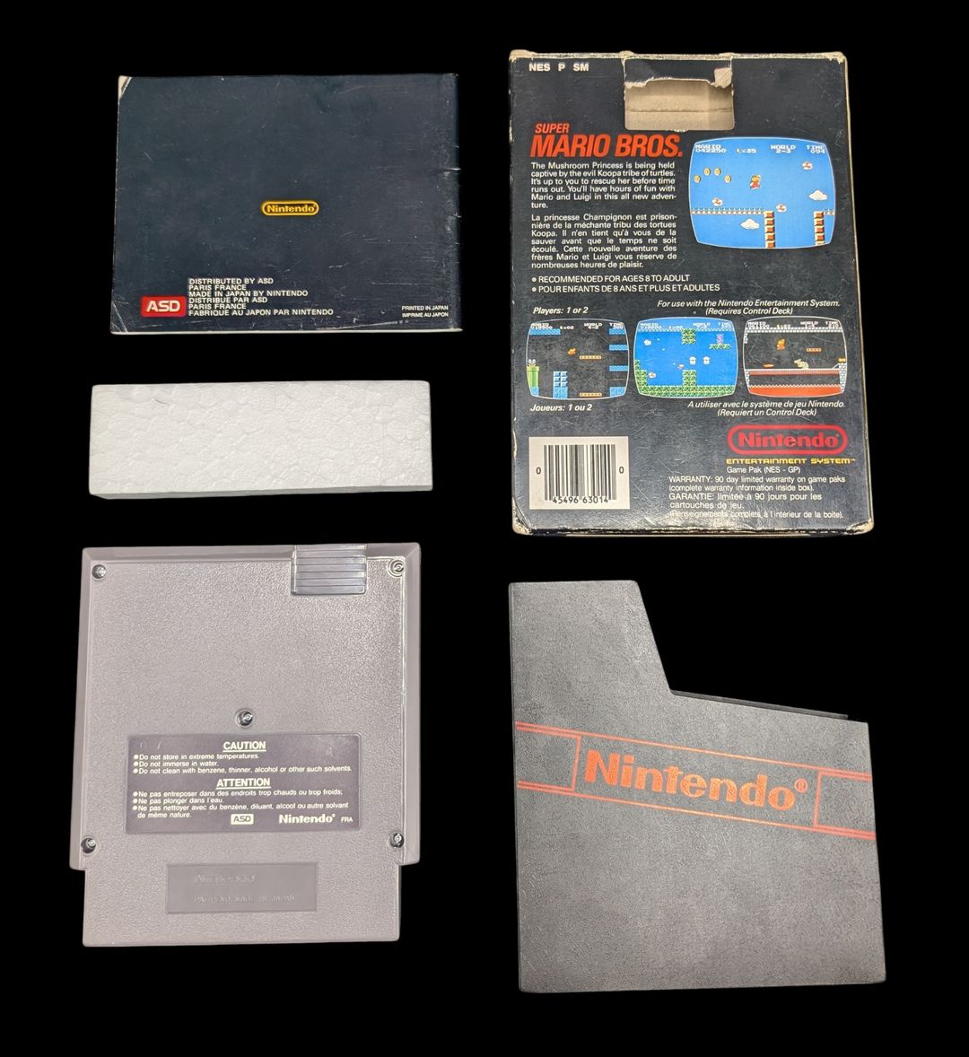 Nintendo – Nes – Jeu Super Marios Bros. Avec boîte, fourreau, notice, cale en polystyrène. Version du jeu FRA. Mention ASD (Première distribution française).