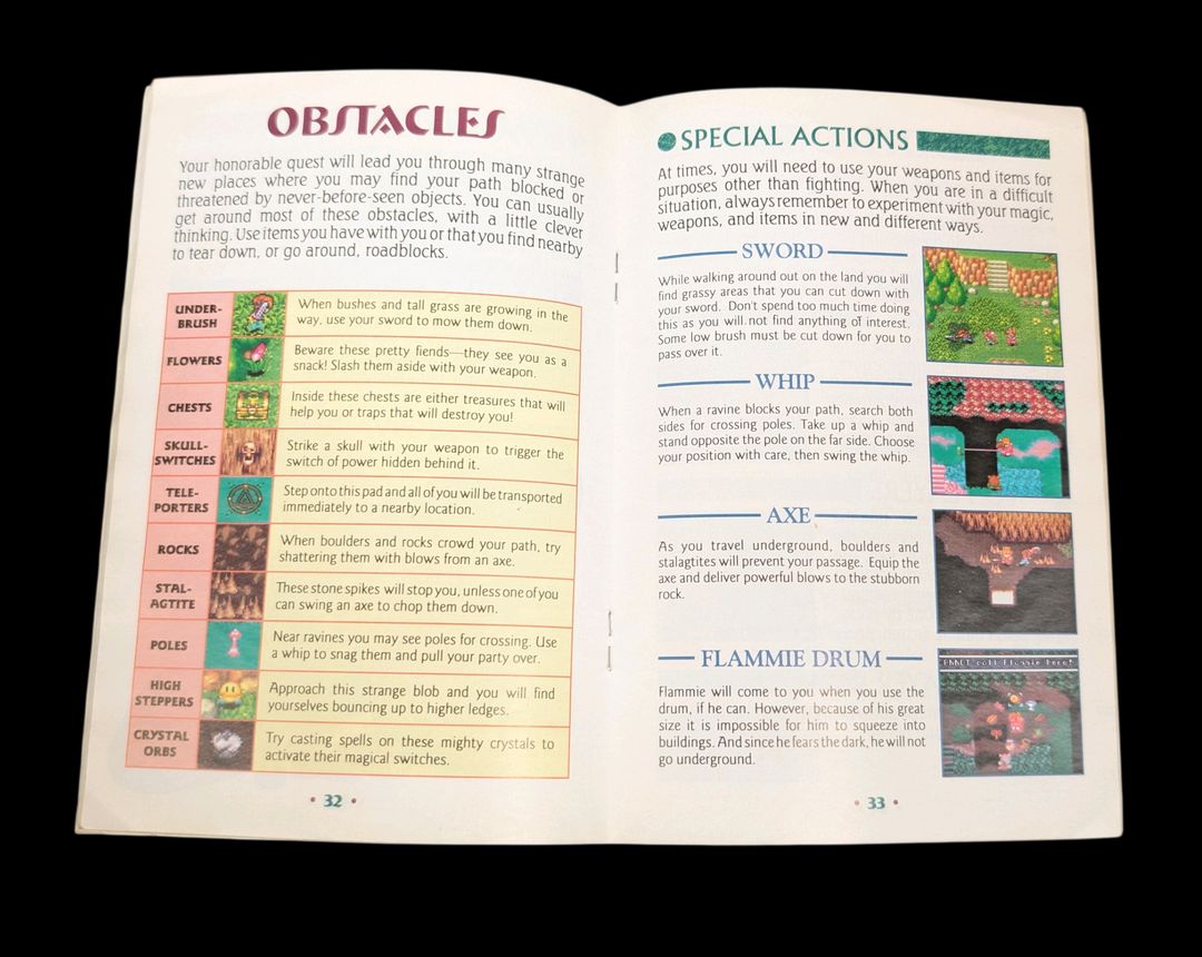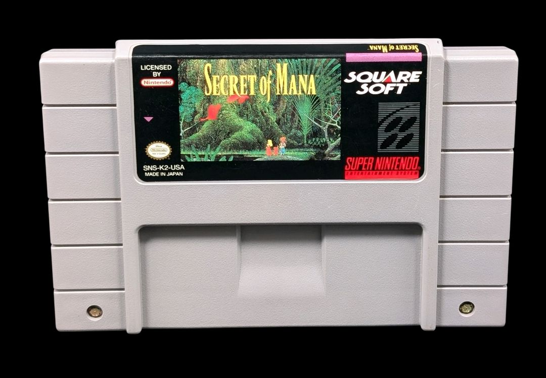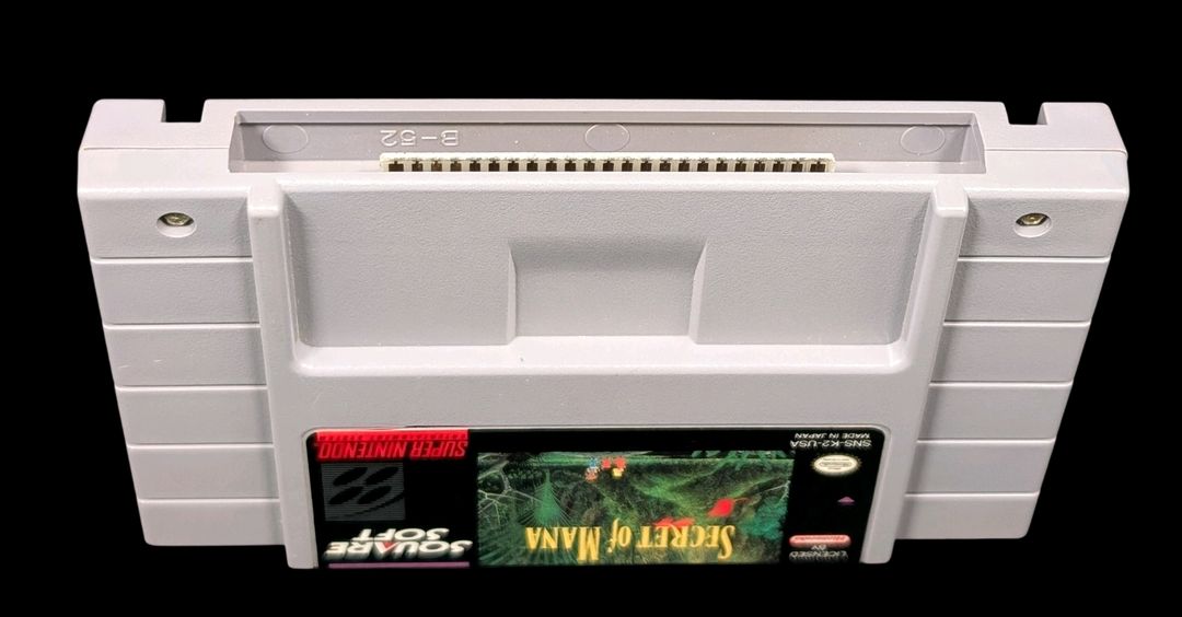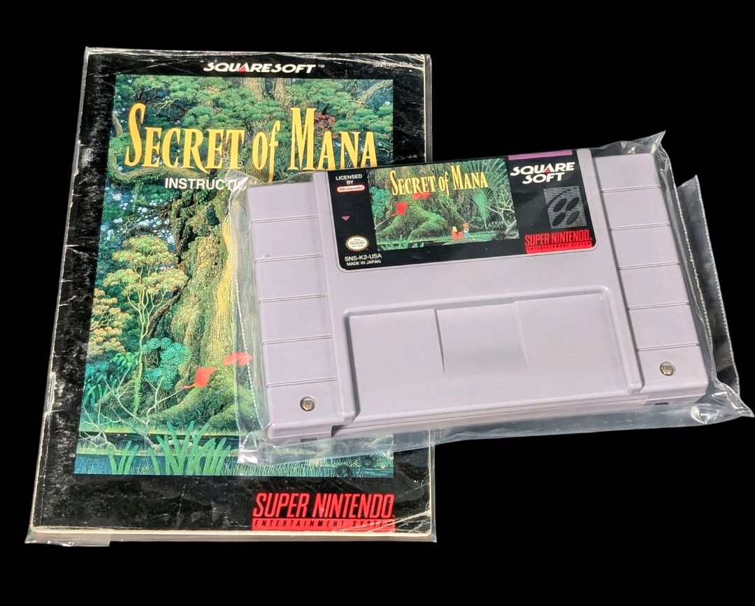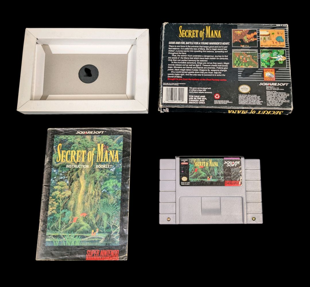 Nintendo – Super NES – Jeu : Secret Of Mana. Avec boîte, cartouche, notice, sachets de protection pour la cartouche & la notice, cale en carton. Version du jeu NTSC (USA/CAN).