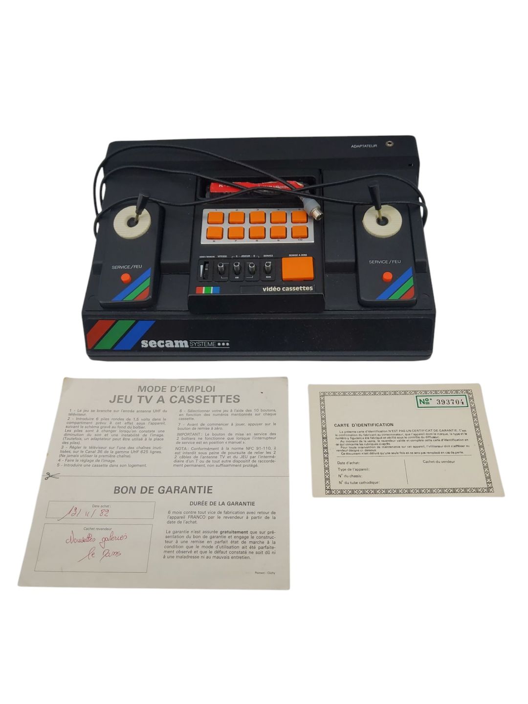 SECAM – Console Jeu vidéo à cassettes – Comprend la boite, la prise, 4 cassettes, mode d’emploi, carte d’identification – Non testé
