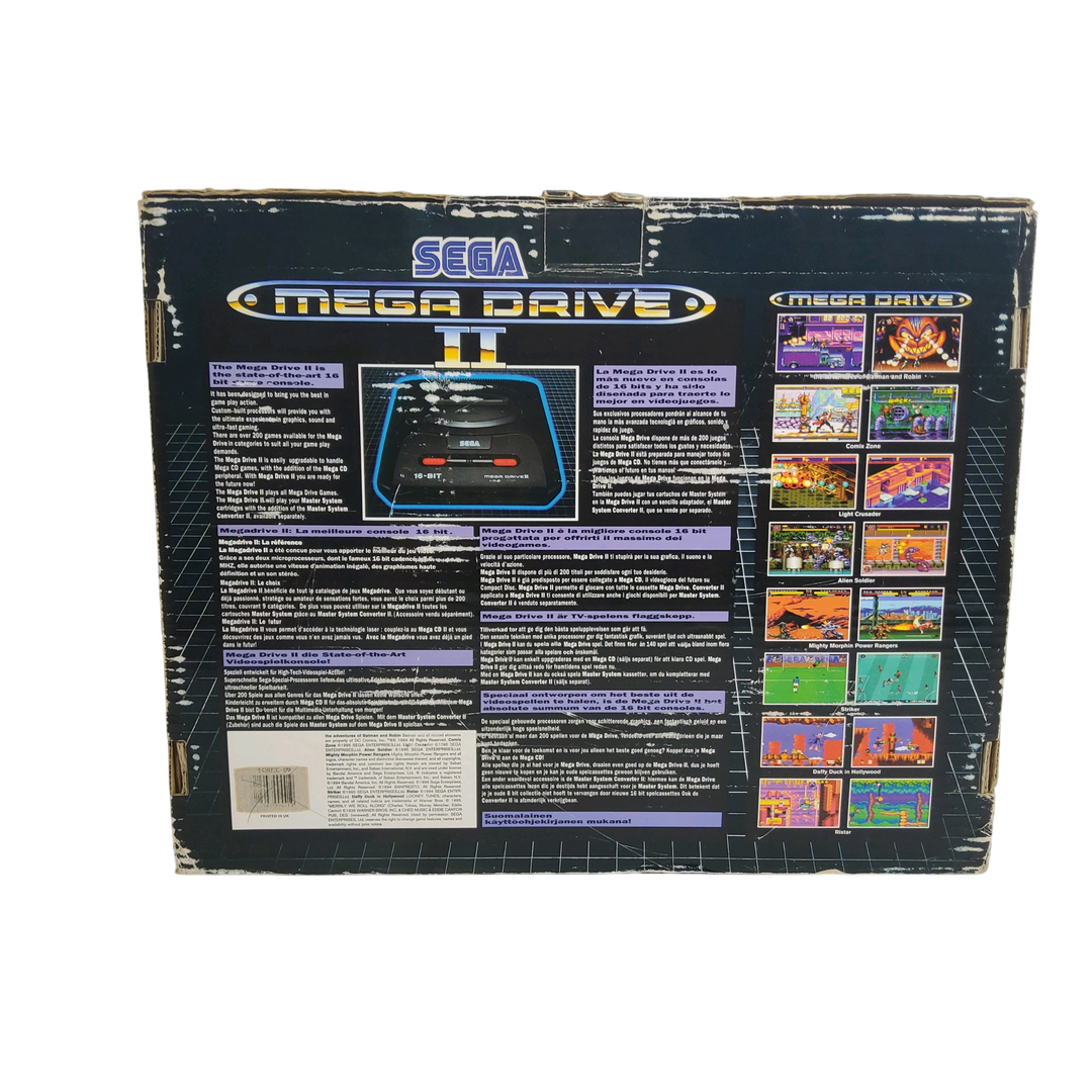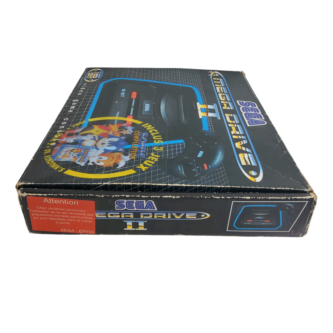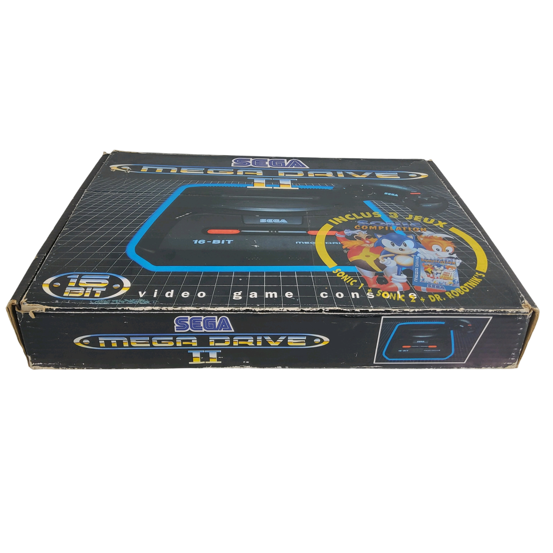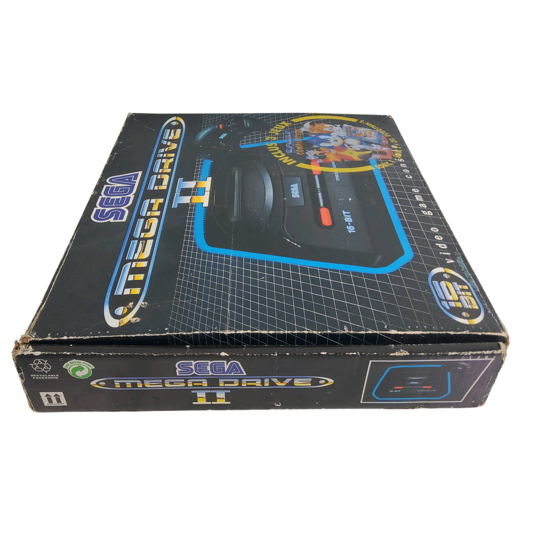 Sega – Mega Drive II – Console de salon (161046054) avec son coffret Sonic Compilation – Test d’allumage effectué avec succès. Avec cartouche & boîte de jeu, manette (défectueuse), notices, câble d’alimentation, câble TV, cale en carton.