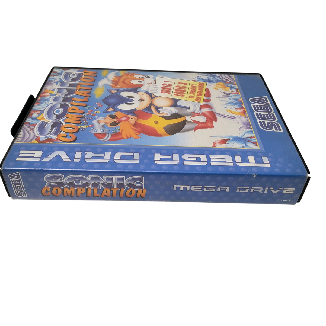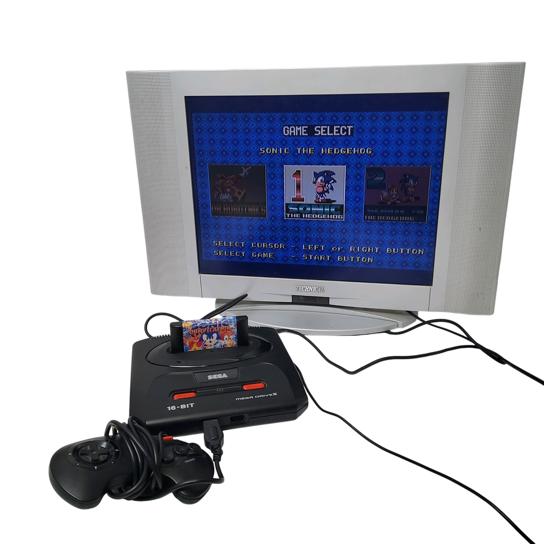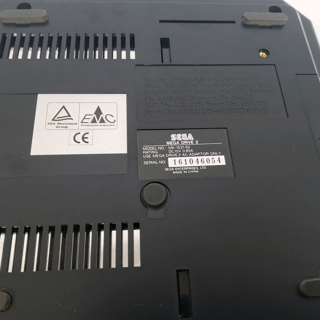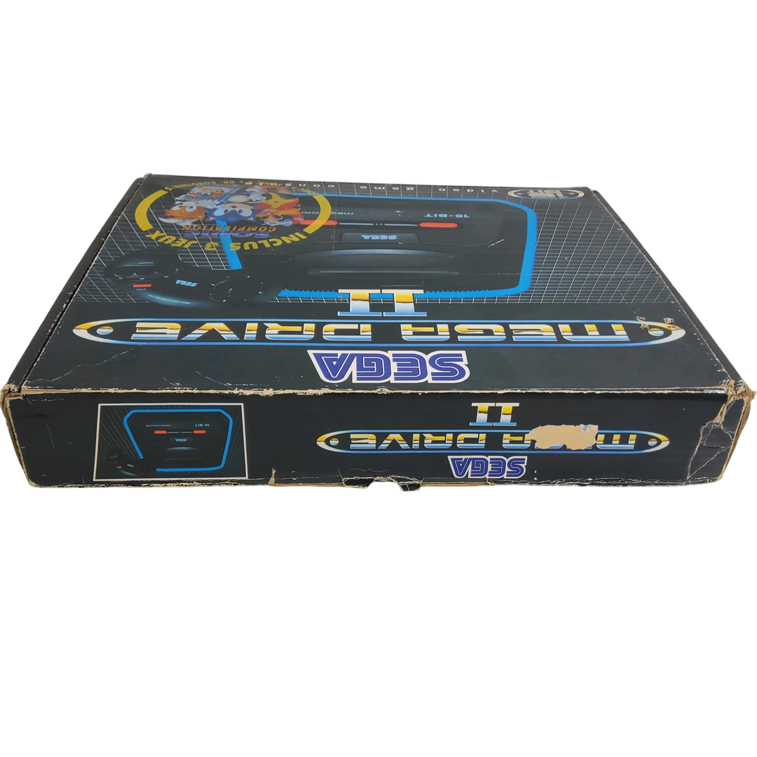Sega – Mega Drive II – Console de salon (161046054) avec son coffret Sonic Compilation – Test d’allumage effectué avec succès. Avec cartouche & boîte de jeu, manette (défectueuse), notices, câble d’alimentation, câble TV, cale en carton.