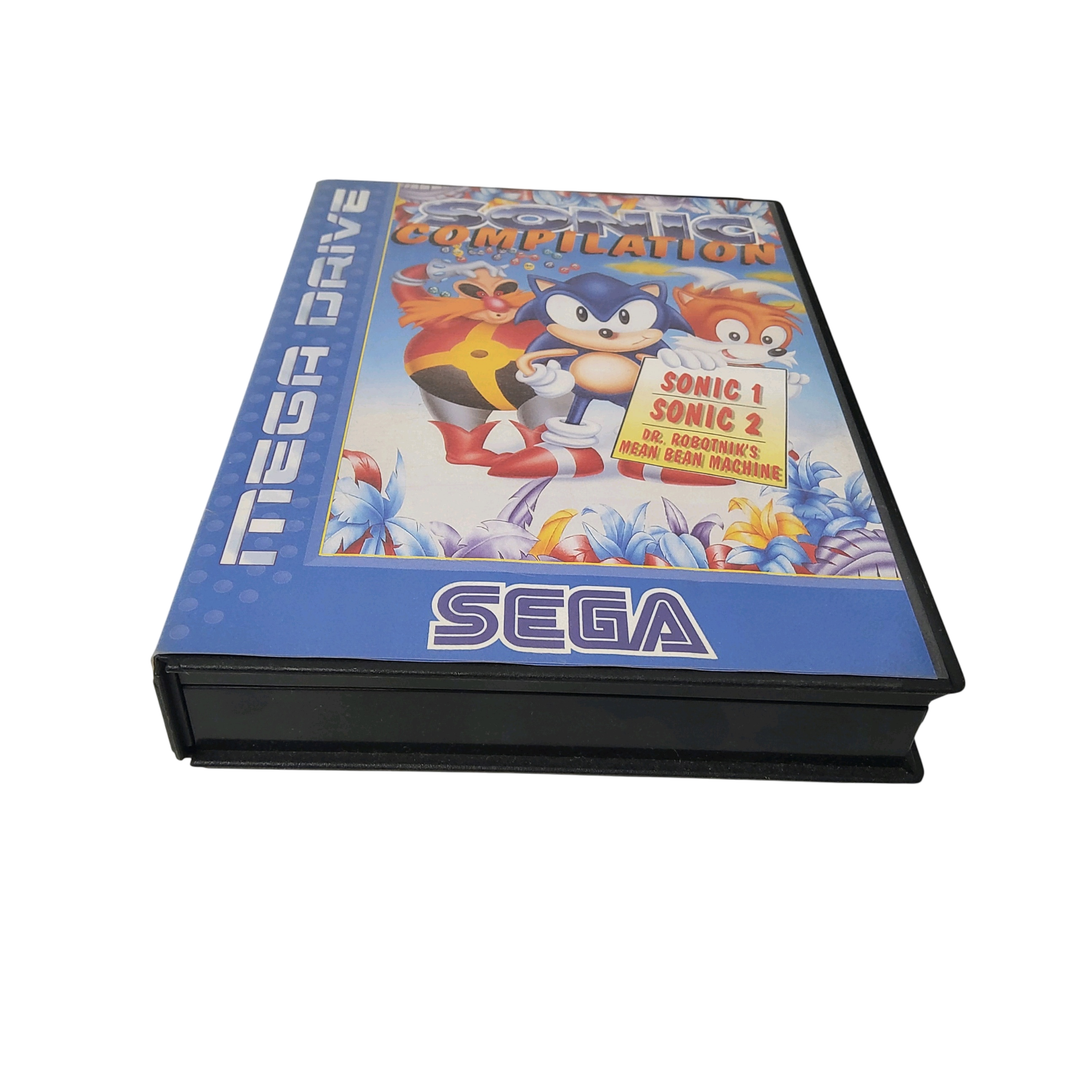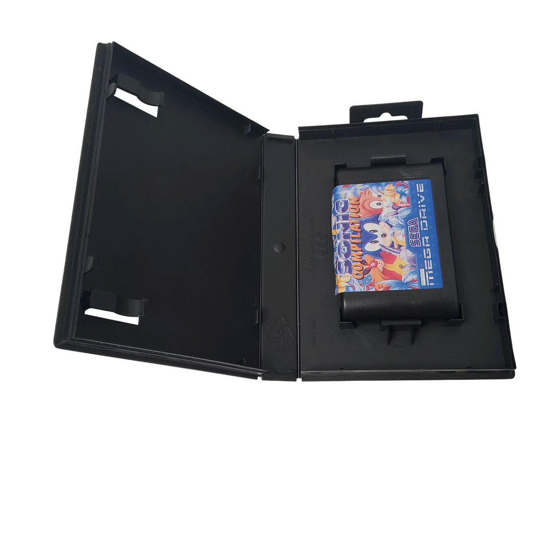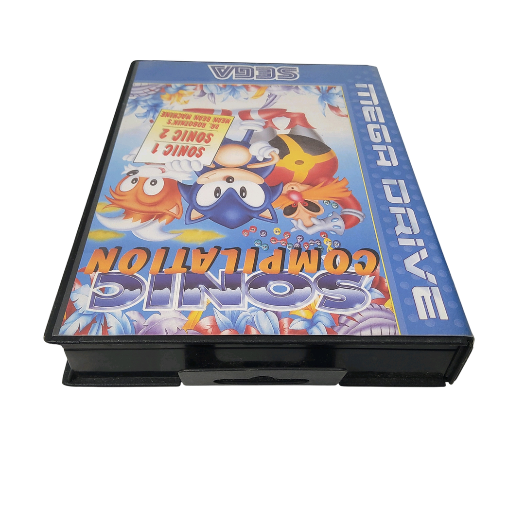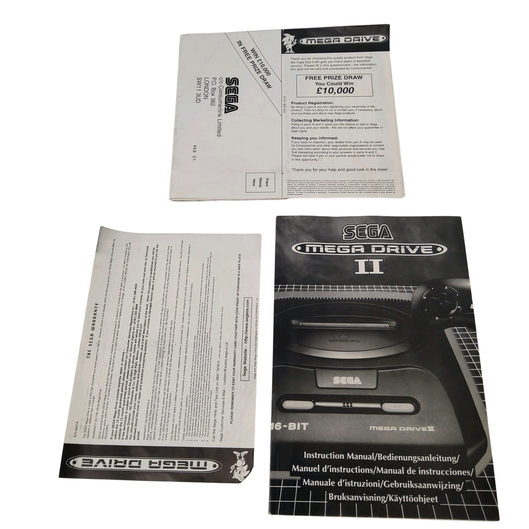 Sega – Mega Drive II – Console de salon (161046054) avec son coffret Sonic Compilation – Test d’allumage effectué avec succès. Avec cartouche & boîte de jeu, manette (défectueuse), notices, câble d’alimentation, câble TV, cale en carton.