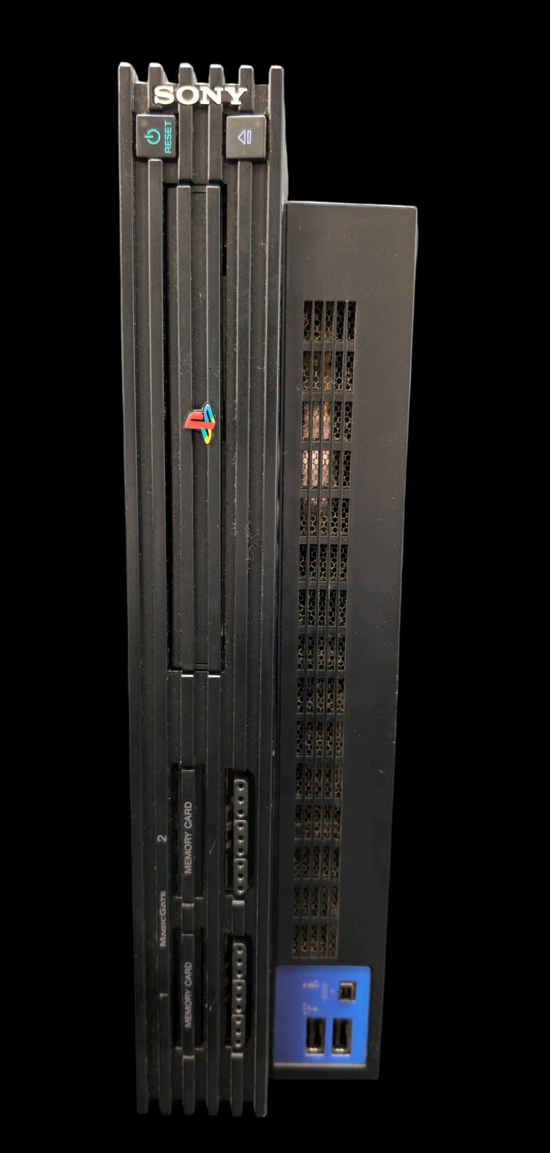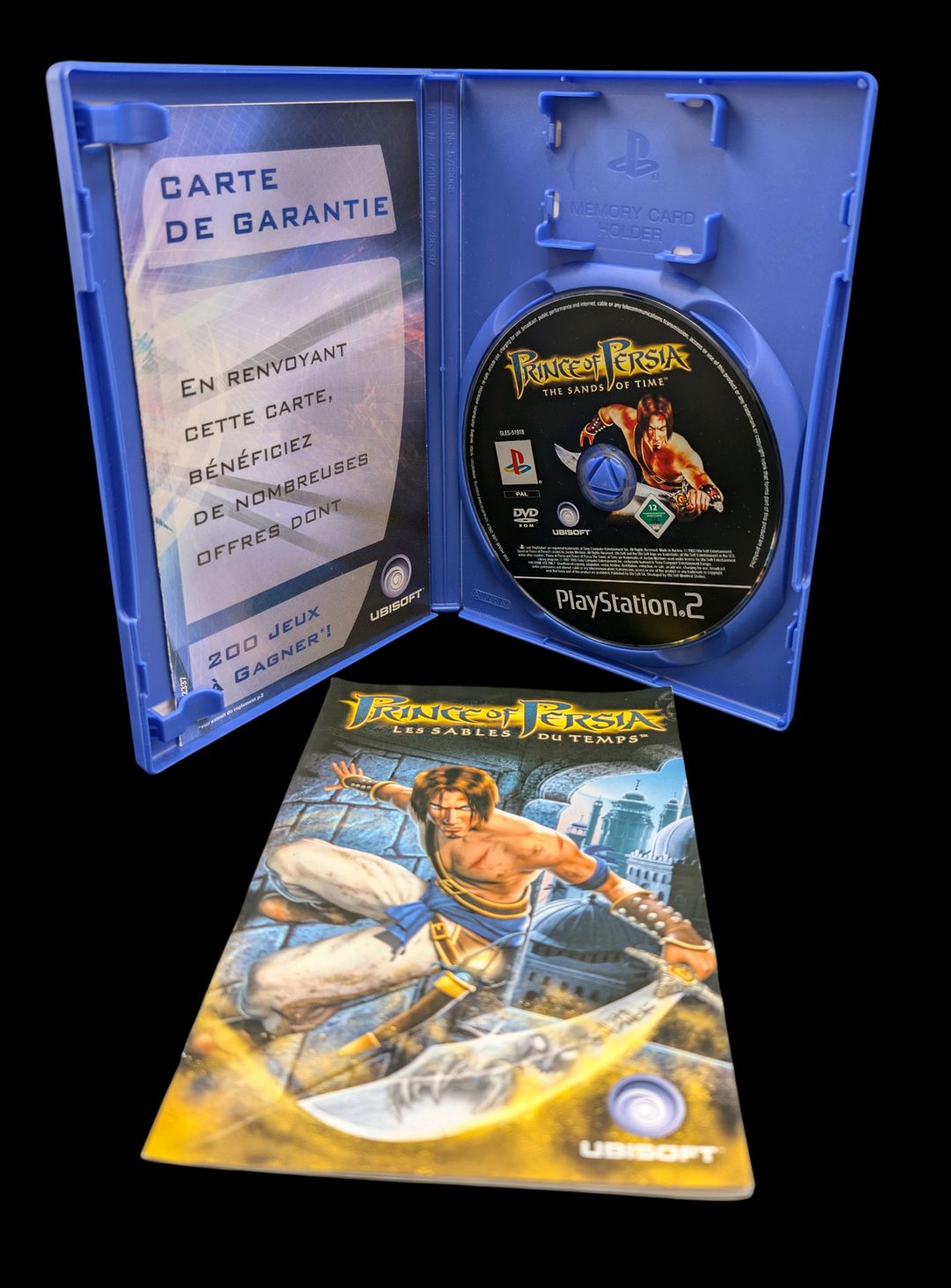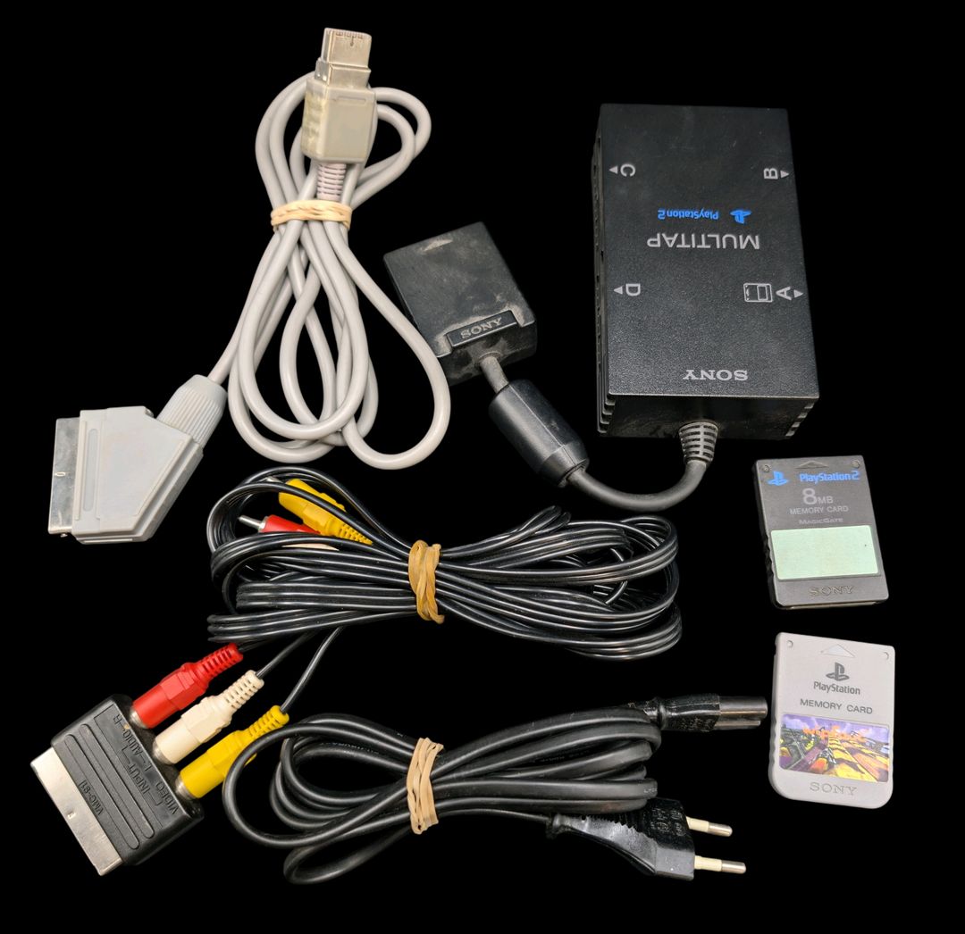 Sony – Console de salon – PlayStation 2. Test d’allumage effectué avec succès. Avec cordon d’alimentation, 2 câbles péritel, 1 adaptateur Multitap, 2 cartes mémoire.