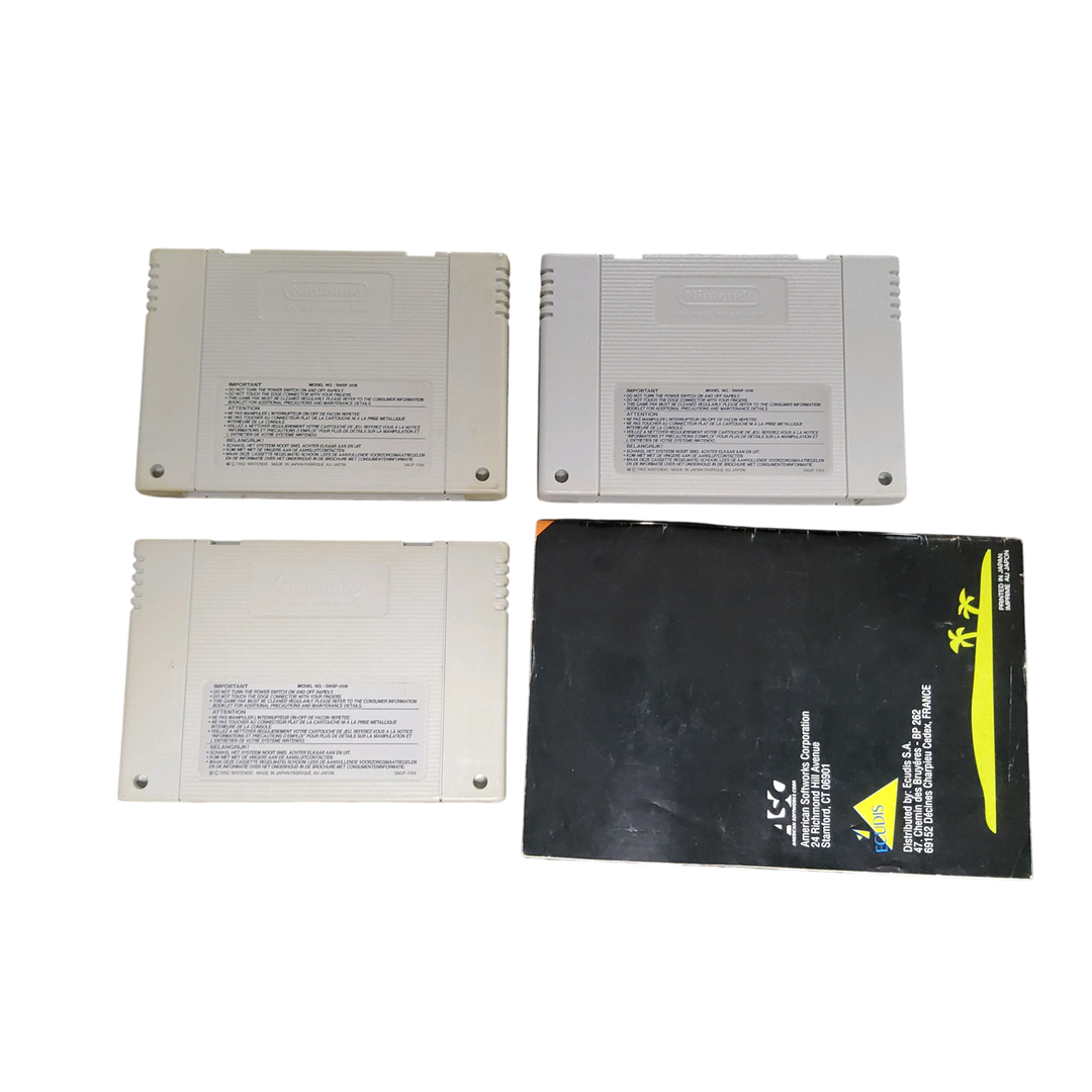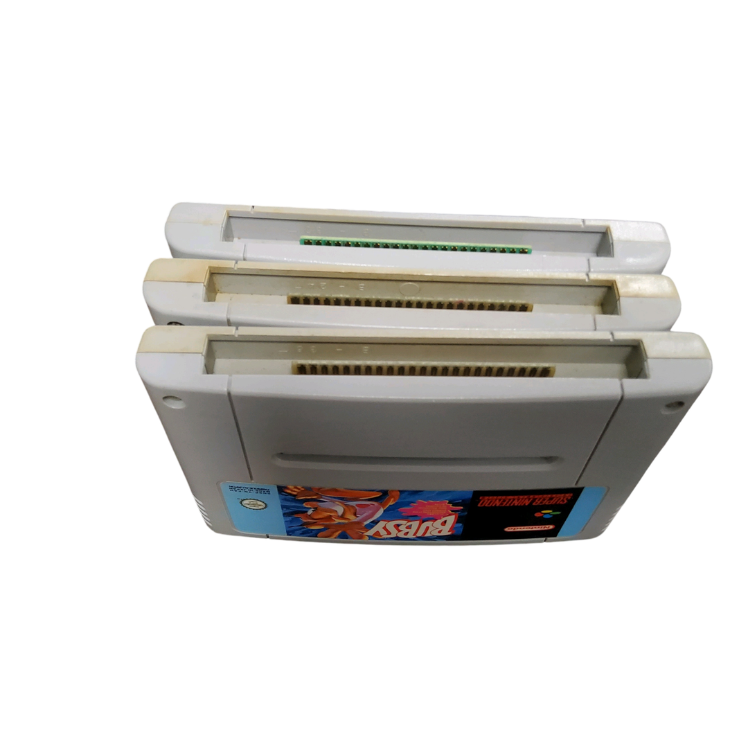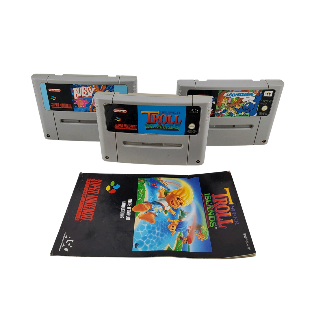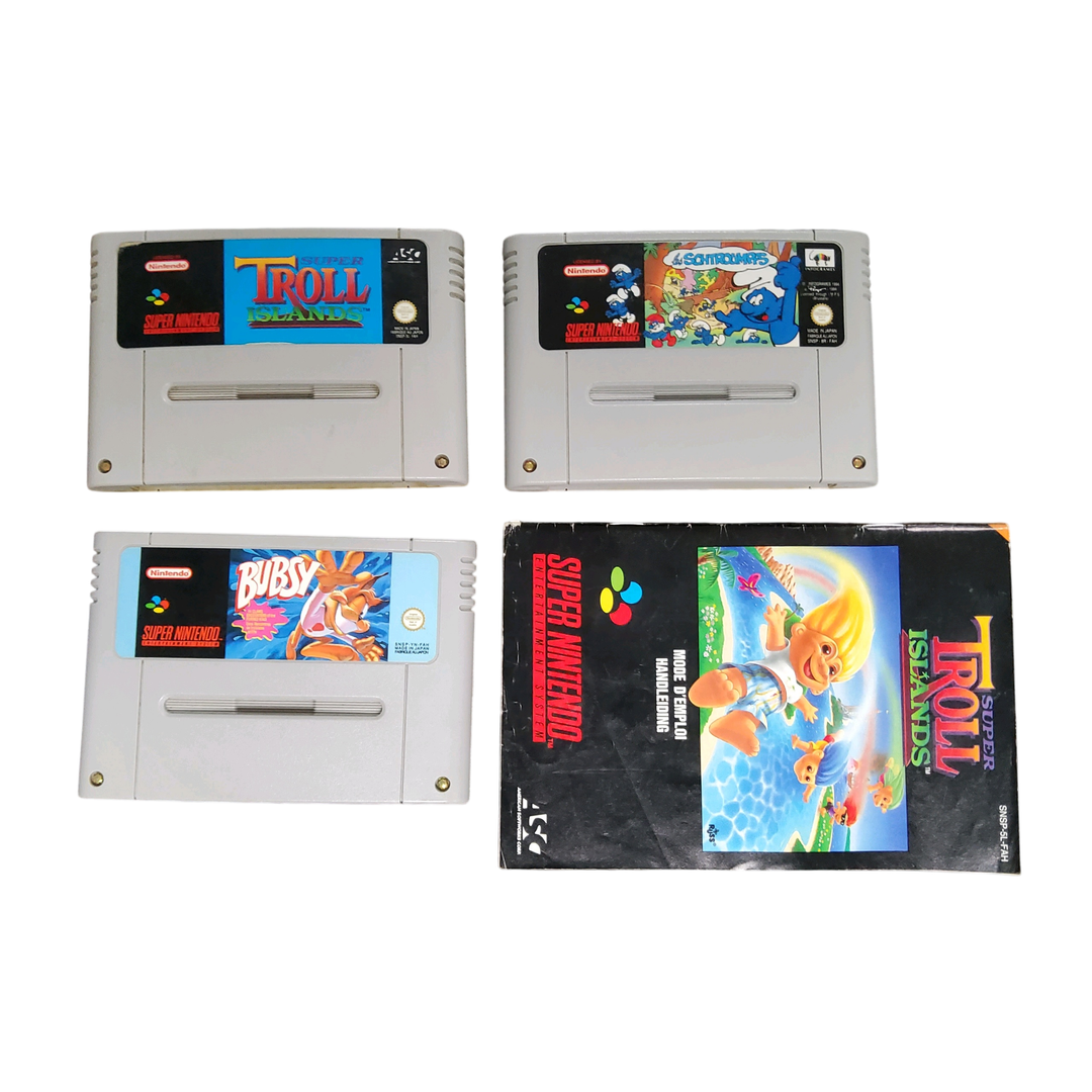 SUPER NES – NINTENDO – Lot de 3 jeux : Super Troll Islands (+notice) + Bubsy + Les Schtroumpfs